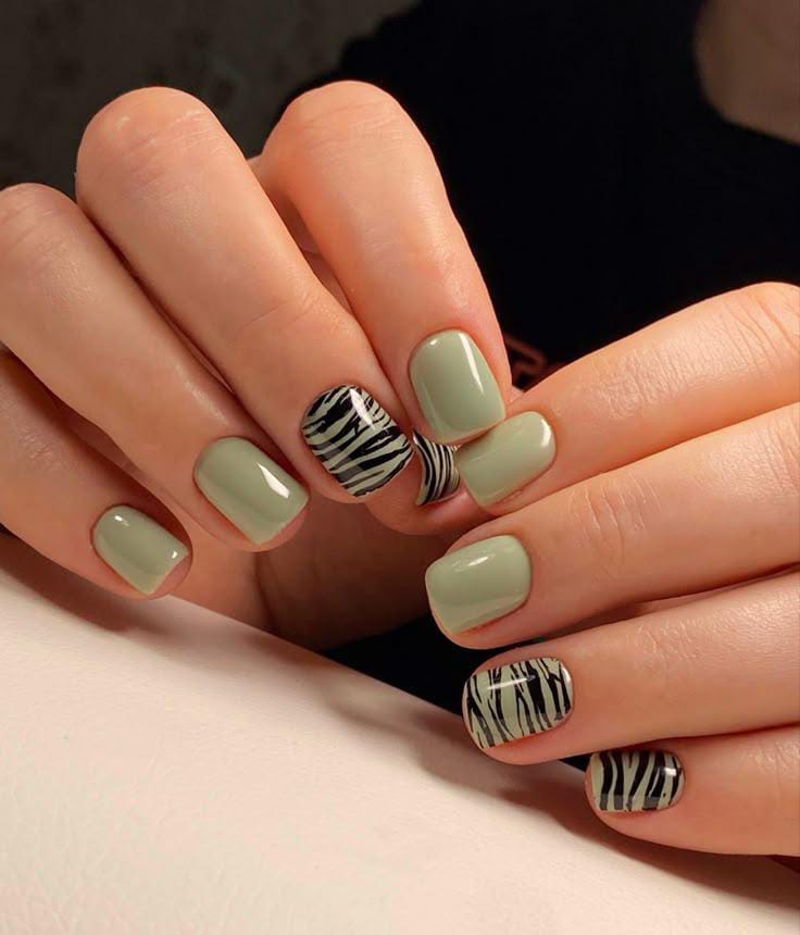 Soft sage green nails are paired with bold zebra print accents, striking the perfect balance between calm elegance and wild flair. A modern and stylish classy choice.