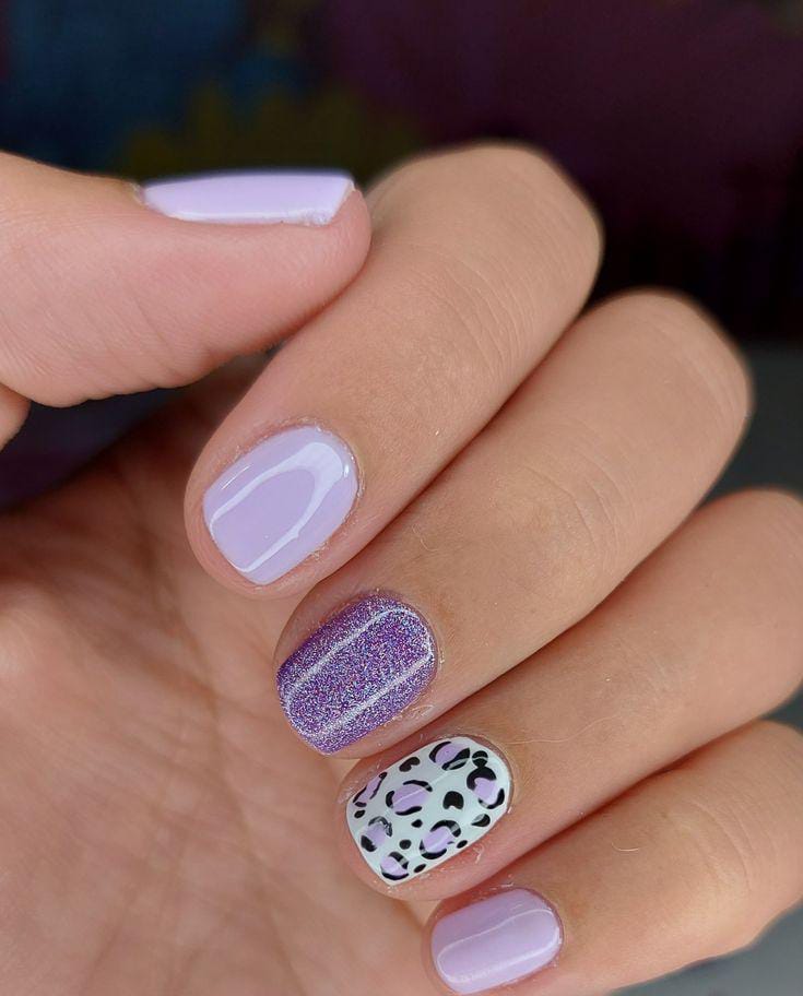 A soothing pastel lilac base is elevated with one shimmering glitter nail and a playful leopard-print accent, blending sweetness with sophistication.