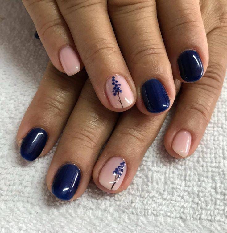 Deep navy nails are softened with nude accents, featuring delicate floral sprigs in blue for a touch of nature-inspired grace. This design is classy yet artistic.