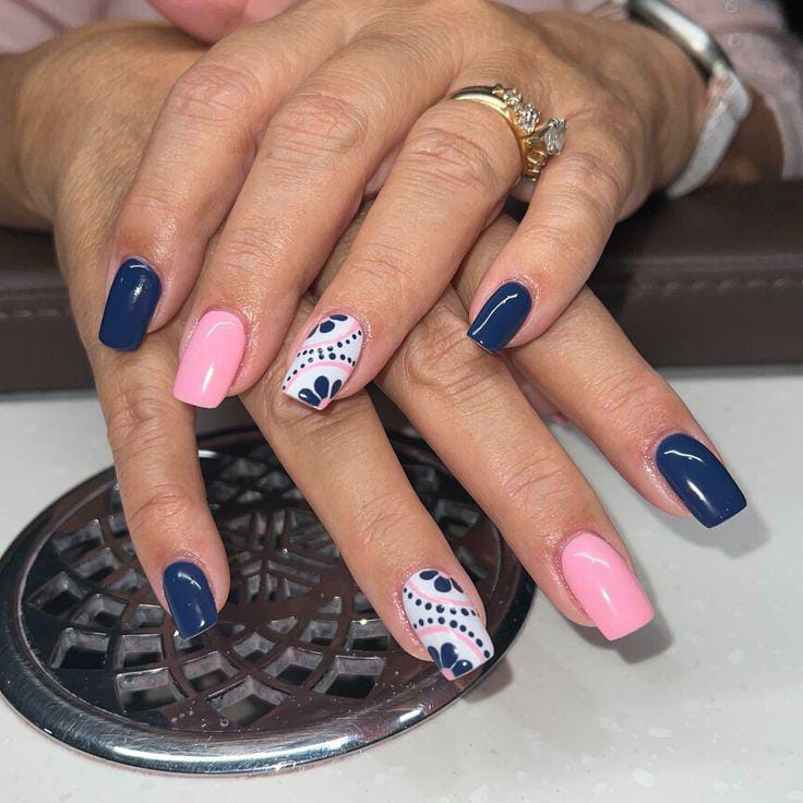Bold navy and soft pink nails come together with a patterned accent nail, mixing polka dots and petal-like shapes in perfect harmony, fashion-forward and classy.