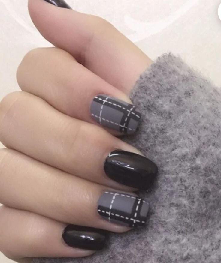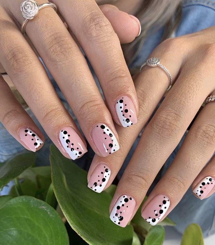 A soft nude and white base is styled with playful black dotted patterns, creating a sleek yet modern vibe. It’s minimalistic but chic, offering a timeless and versatile option.