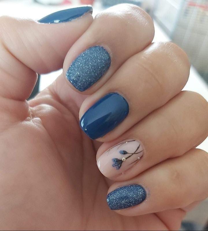 A rich mix of deep blue polish and textured glitter nails, paired with a soft nude accent featuring a delicate floral design. This look balances boldness, making it timelessly elegant.