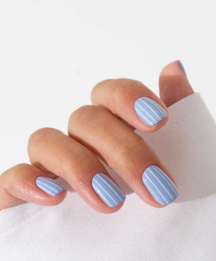 Soft baby blue nails adorned with crisp vertical white stripes for a clean, sophisticated vibe. The design feels fresh, minimal, and effortlessly chic.
