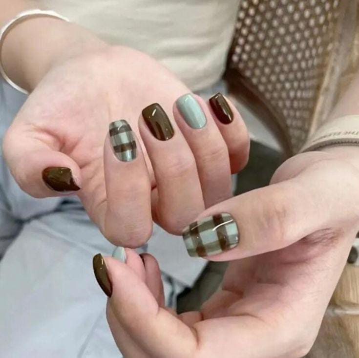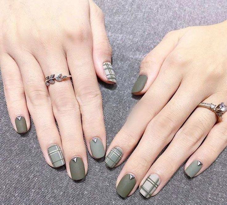 Matte olive green nails are enhanced with plaid patterns and small metallic studs. The mix of texture and geometry adds a classy twist to a bold, confident look.