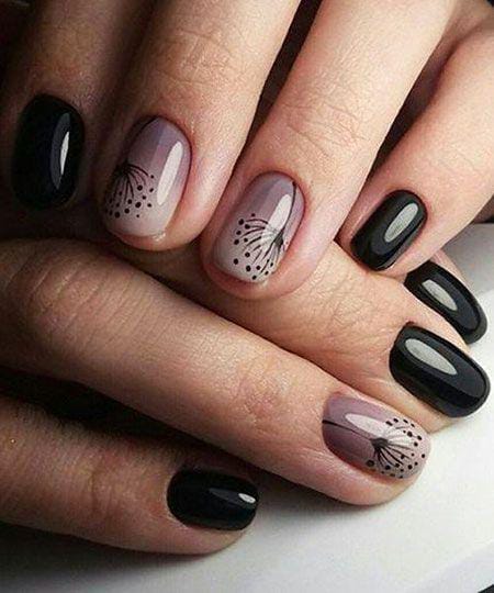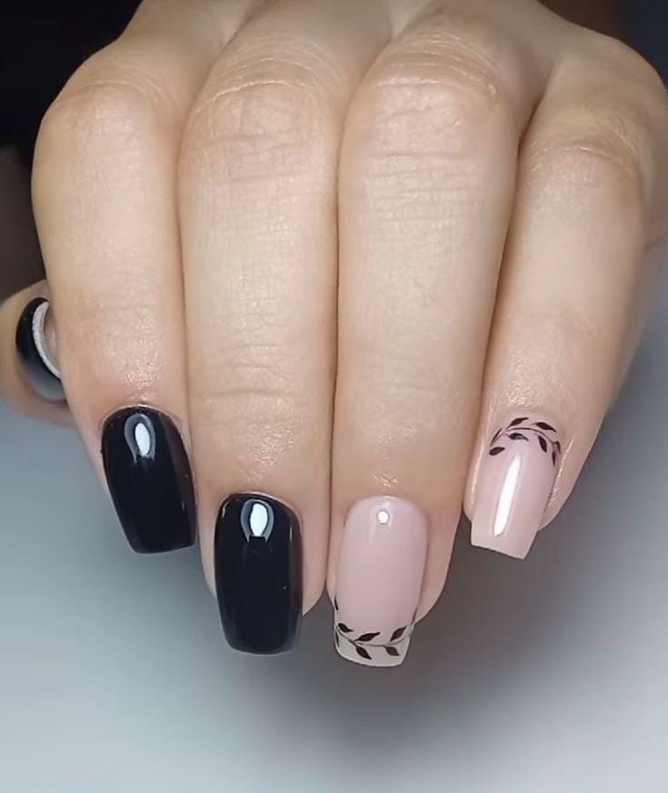 Glossy black nails balanced with nude tones, highlighted by minimal dark leaf details on the lighter base. A modern, refined look that feels timeless.