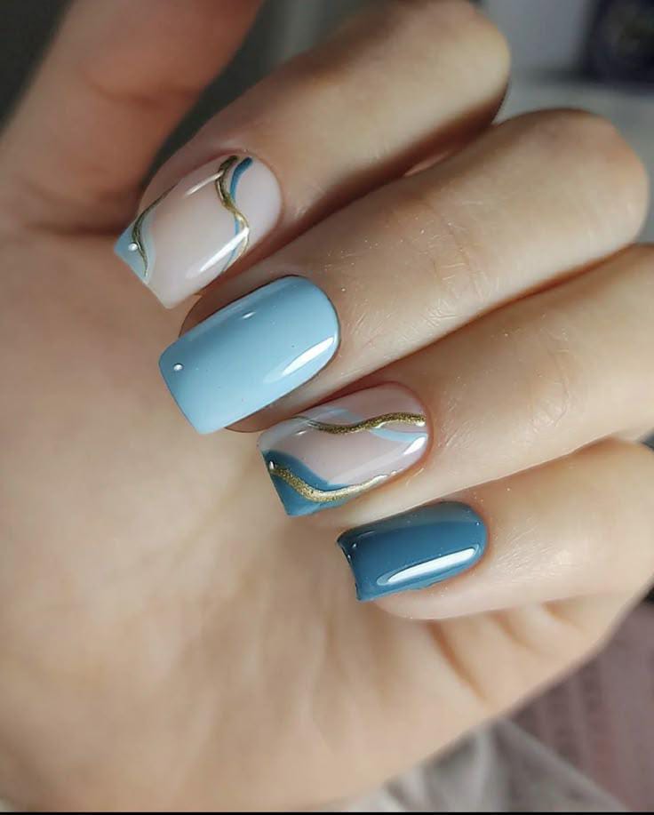 Glossy shades of light and deep blue blend seamlessly with nude nails outlined by flowing gold accents, giving a graceful, wave-like effect that feels both modern and refined.