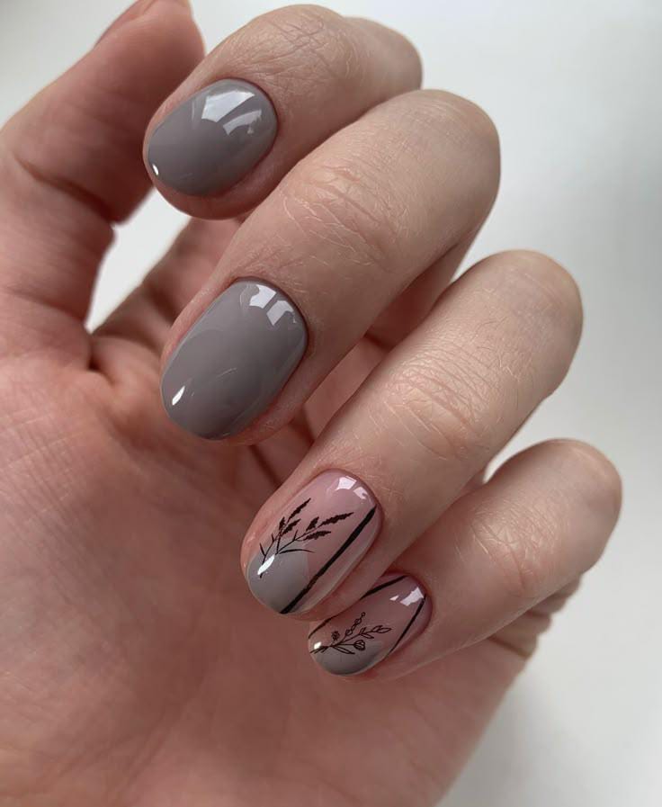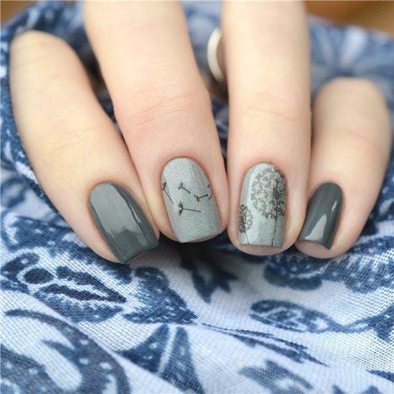 A chic mix of deep gray polish paired with matte gray nails featuring delicate dandelion art. The balance of solid tones and subtle floral patterns creates a modern yet graceful vibe.