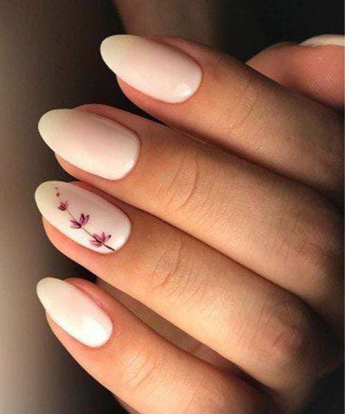 These nails glow with a soft pale white base and a gentle floral accent in purple. The minimalist detail makes the design romantic and refined.
