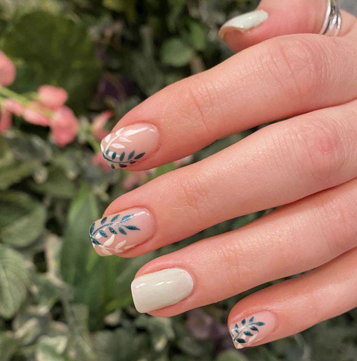 Neutral nude tones are elevated with leafy teal and white accents, giving the nails a fresh, nature-inspired charm. The look feels airy and elegant at the same time.