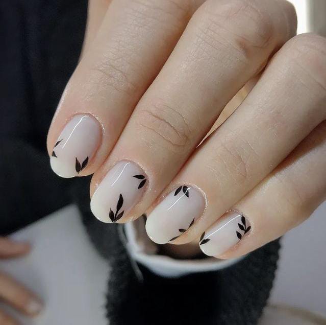 A clean, sheer nude base decorated with tiny black leaf motifs makes for an elegant design. Simple yet stylish, it embodies effortless sophistication.