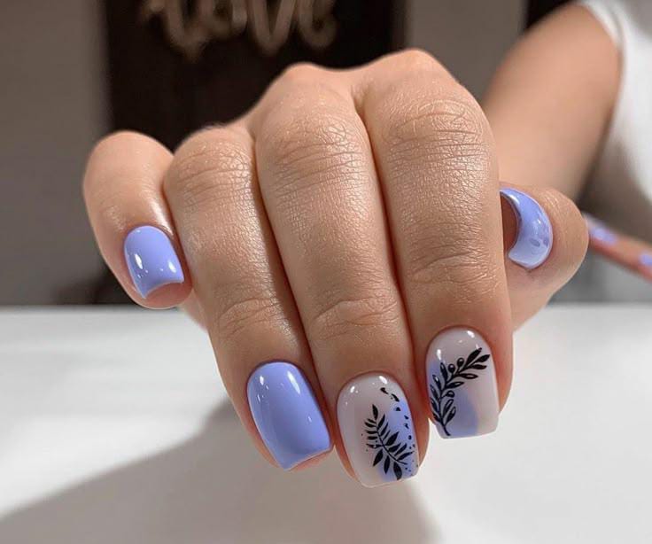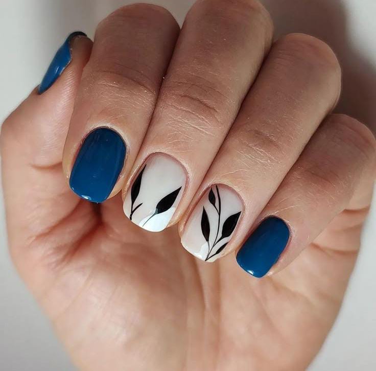 A bold mix of deep blue nails paired with soft white accents, finished with sleek black leaf patterns. The contrast gives a sophisticated yet classy artistic edge.