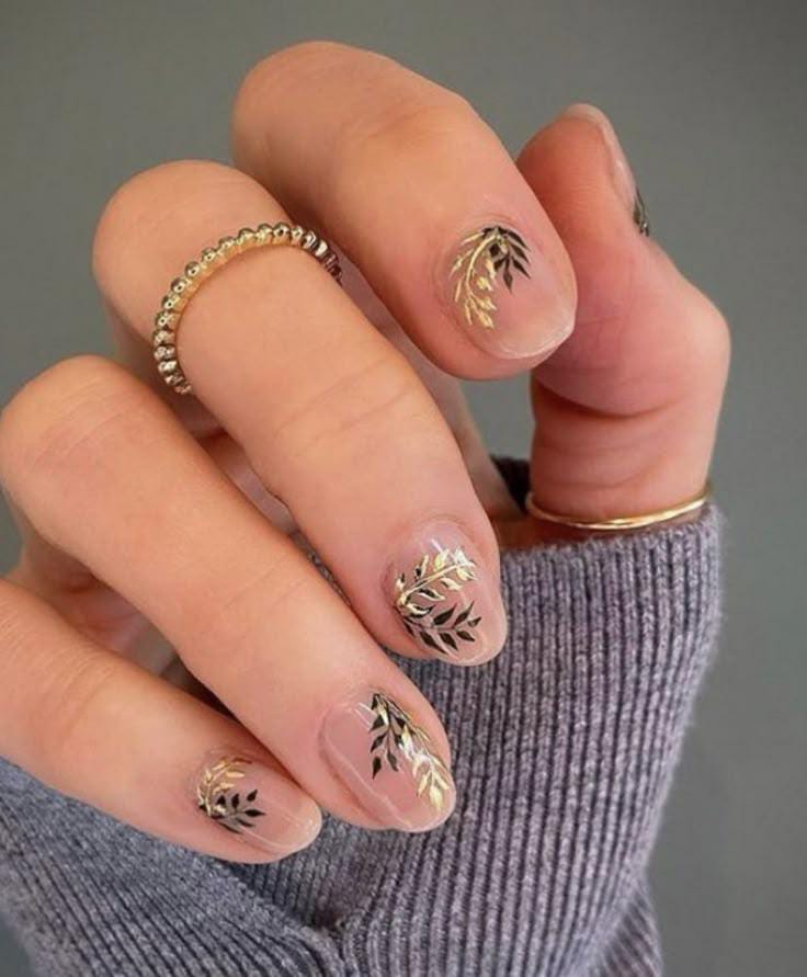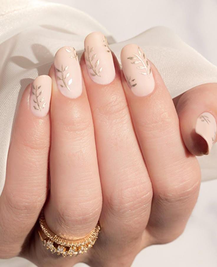 A soft nude base polished with delicate golden leaf accents gives this design an elegant look. The scattered placement of the foil details adds sophistication.