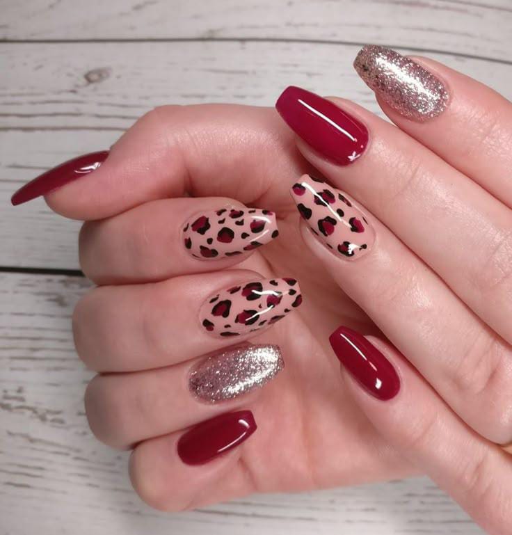 Deep wine-red nails are paired with shimmering glitter and chic leopard-print accents, striking a perfect harmony of boldness and elegance for a standout, classy style.