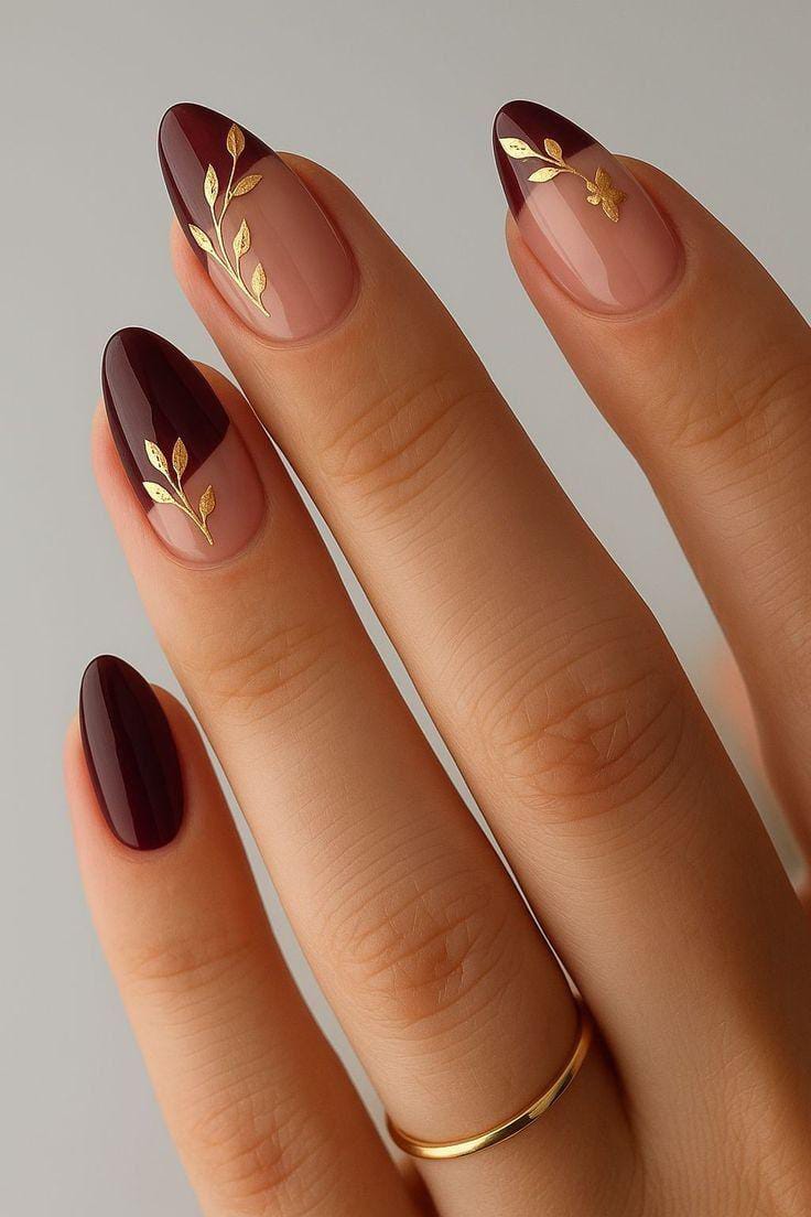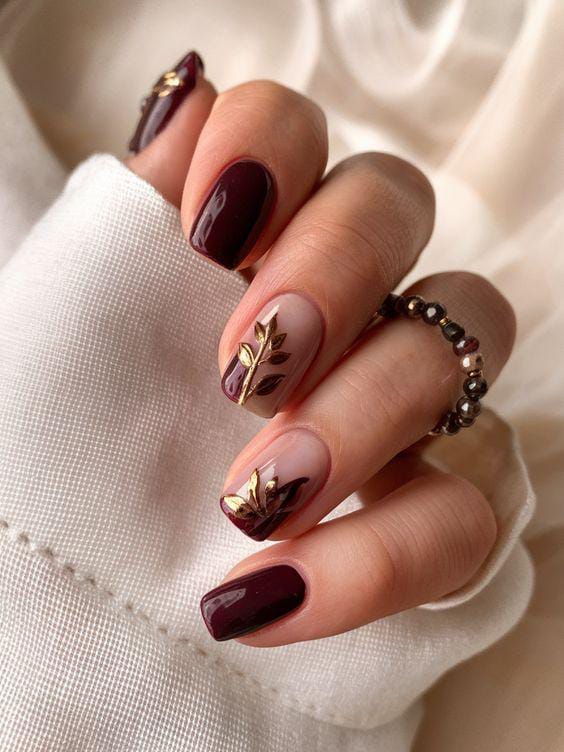 Rich burgundy nails with nude accents, detailed with golden leaf embellishments. The metallic shine adds a regal and high-end touch.