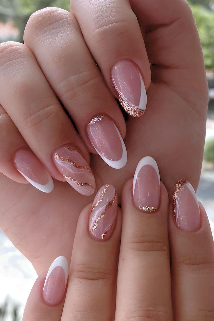 A modern spin on the French manicure with a soft pink base, white tips, and flowing touches of golden shimmer. The combination feels timeless and graceful with a hint of glam.