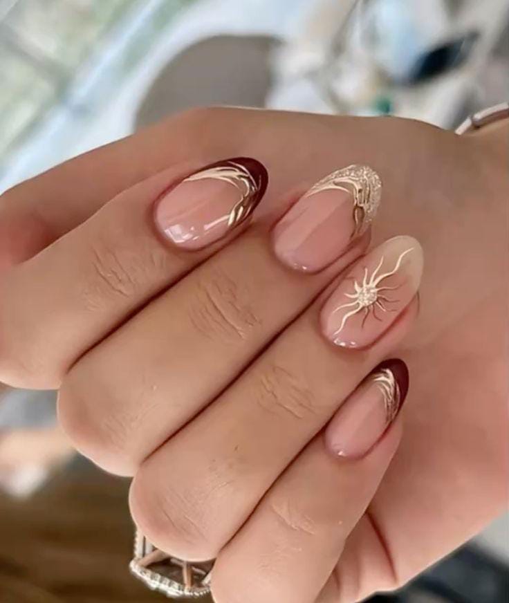 Warm nude nails accented with deep wine-red tips and golden linework, plus a starburst-style detail on one nail. The bold contrast gives off a confident, elegant, and slightly dramatic vibe.