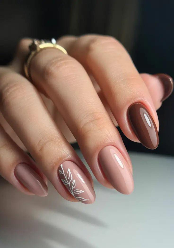 A blend of warm nude and rich chocolate brown nails, complemented by a simple white leafy accent. The earthy tones and minimal art create a polished, classy look with natural elegance.