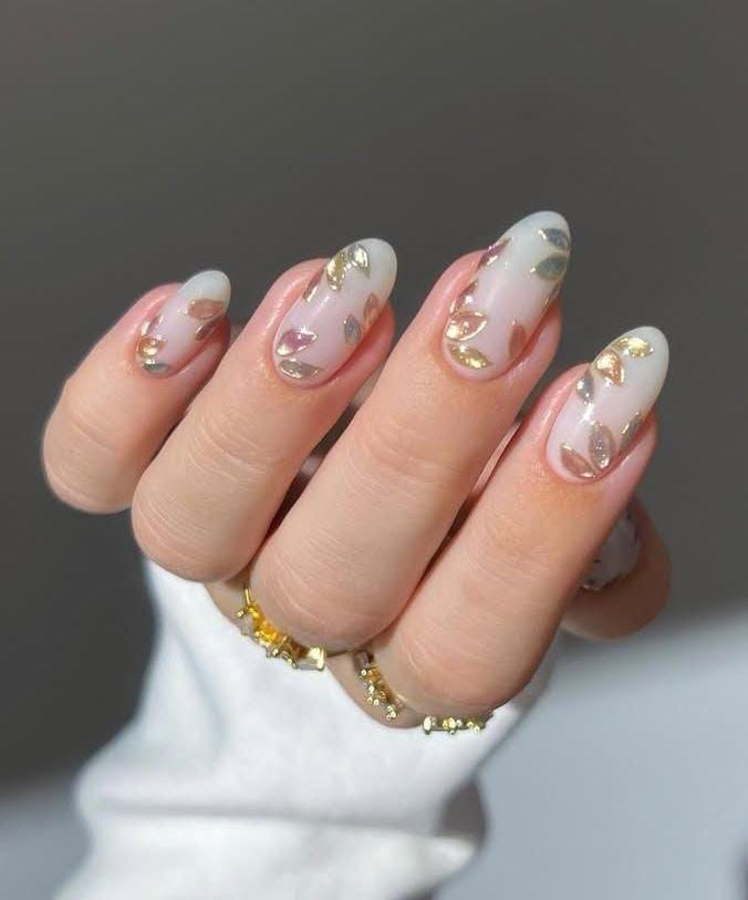 Soft translucent white nails adorned with scattered golden and metallic leaf motifs give a dreamy, frosted finish. The mix of shimmer and subtle color creates an airy, and stylish.
