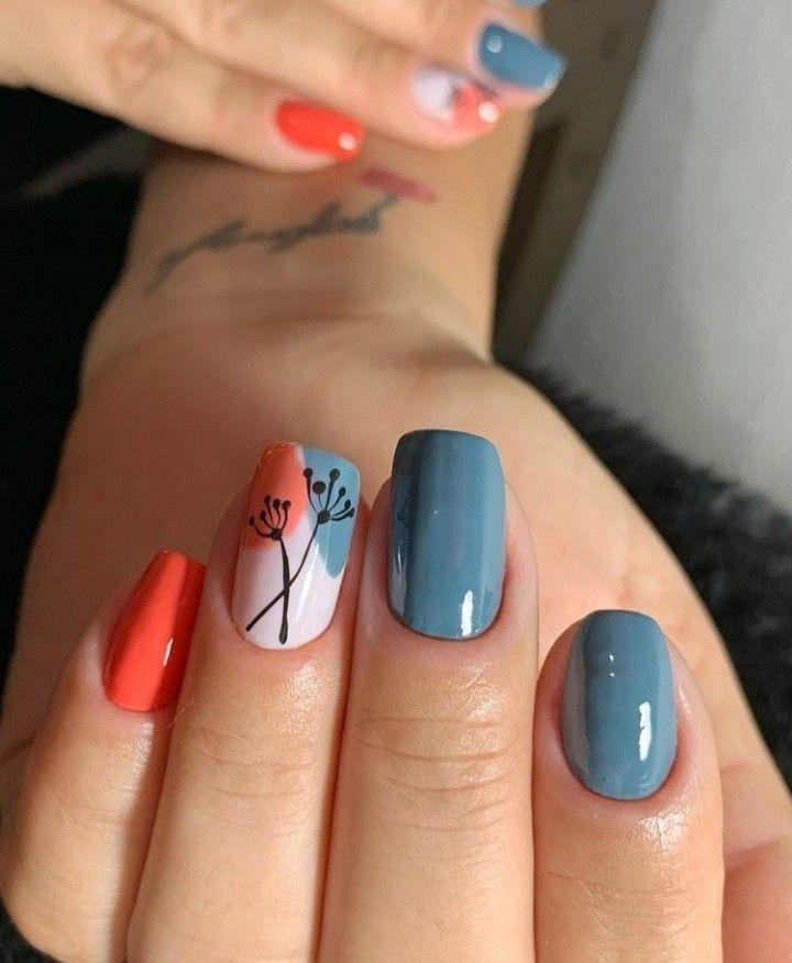 This design mixes muted blue and coral shades with a nude base adorned by delicate black floral art, creating a graceful, artsy look inspired by evening blooms.