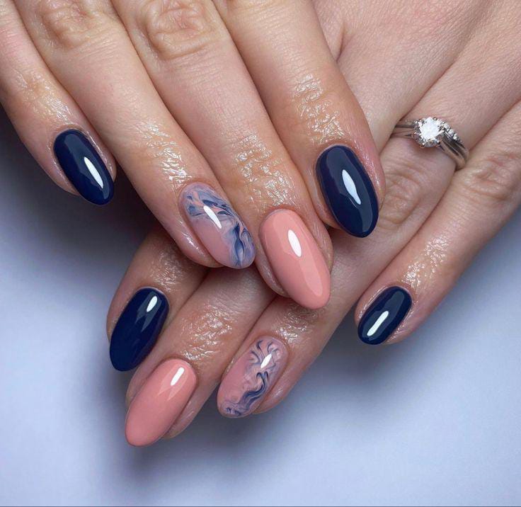 A sophisticated mix of deep navy and soft blush pink, accented with marble swirls for a chic, modern look. The contrast of bold and delicate shades makes this design timeless and graceful.
