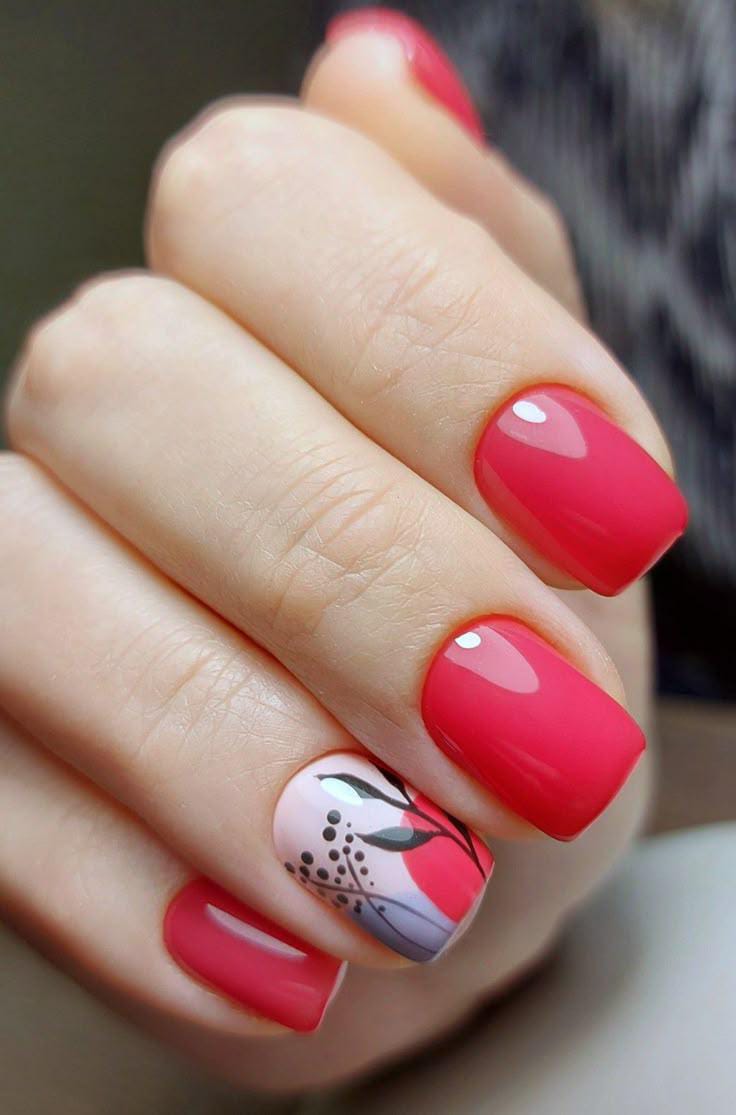 Shocking pink nails softened with a floral-inspired accent nail in pastel tones. This design blends boldness with a touch of artistic elegance, ideal for making a classy statement.