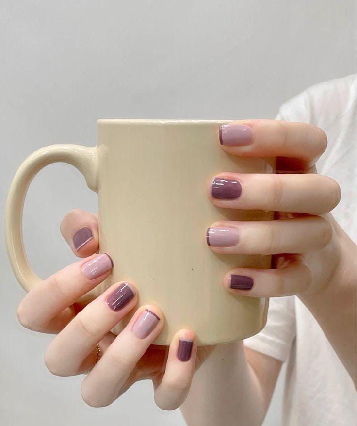 A calming blend of mauve and dusty lilac shades, alternating across the nails with contrasting tips. The soft hues create a subtle, sophisticated style that feels both modern and classy.