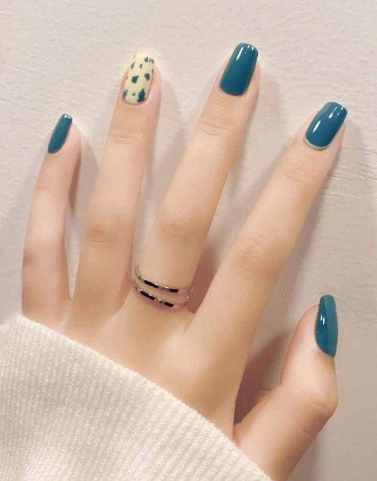 Neutral nude tones are elevated with leafy teal and white accents, giving the nails a fresh, nature-inspired charm. The look feels airy and elegant at the same time.