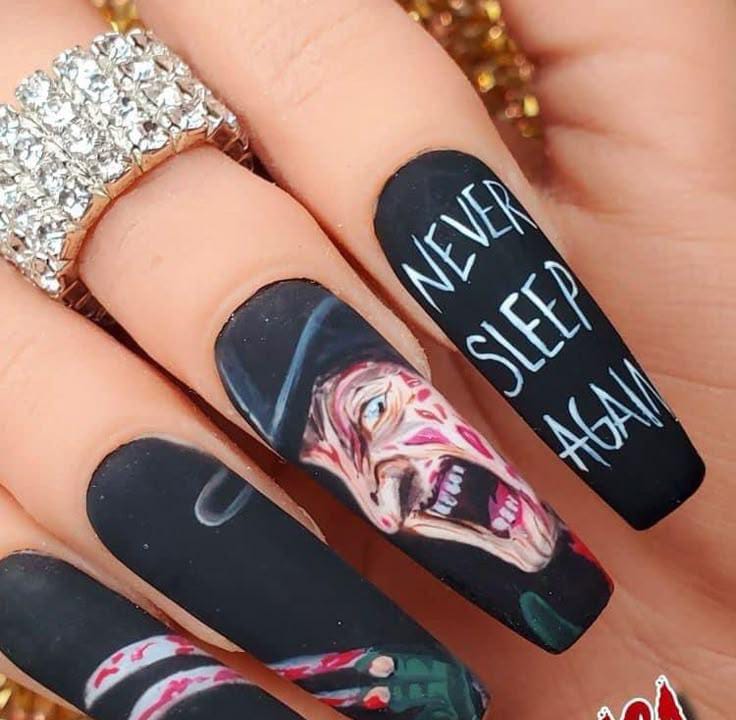 Square nails combine Freddy’s stripes, scratch marks, his chilling face, and text designs like “Never Sleep Again” and “Elm Street” in a gritty horror vibe.