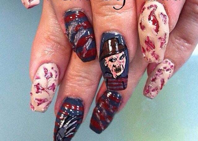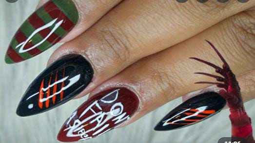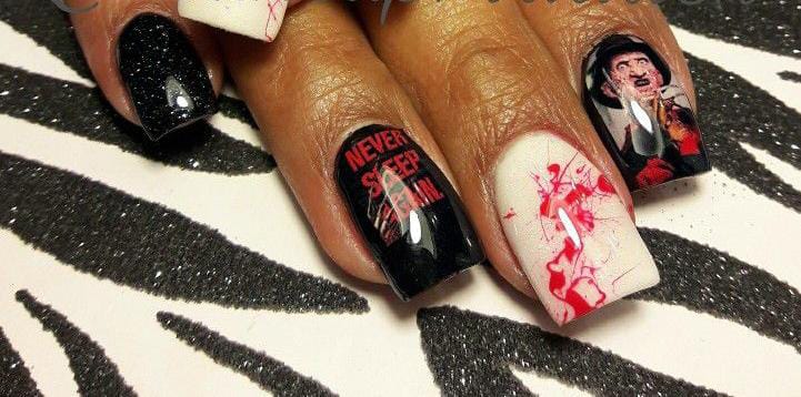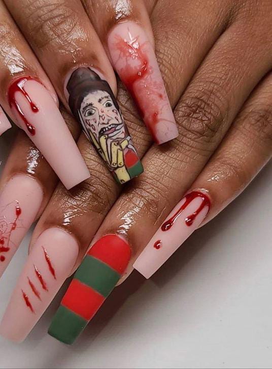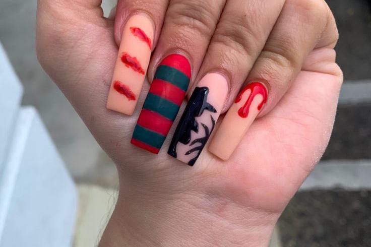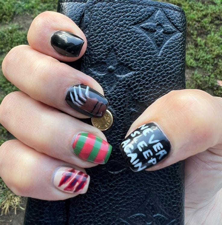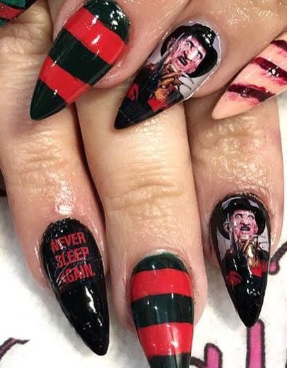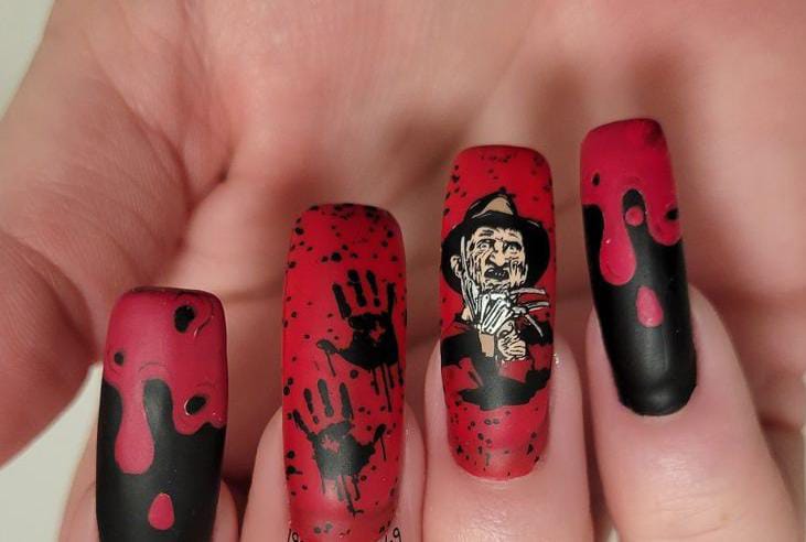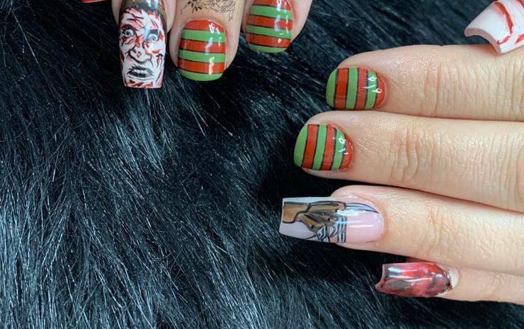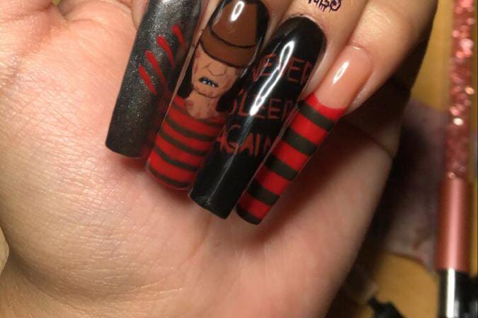 Glossy black and red striped nails with Freddy’s face and scratch marks capture the classic slasher feel.
