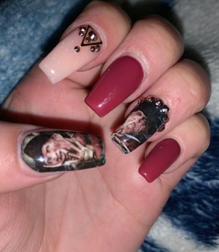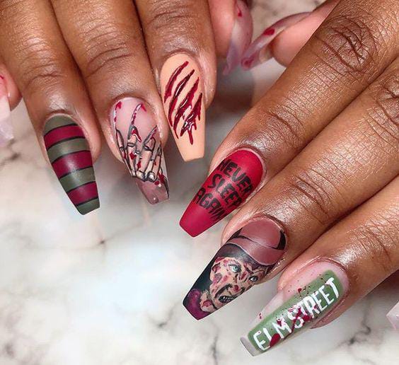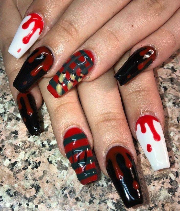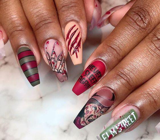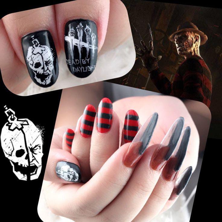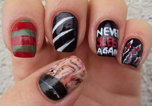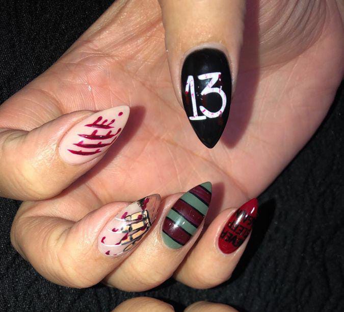 Glossy black and red striped nails with Freddy’s face and scratch marks capture the classic slasher feel.
