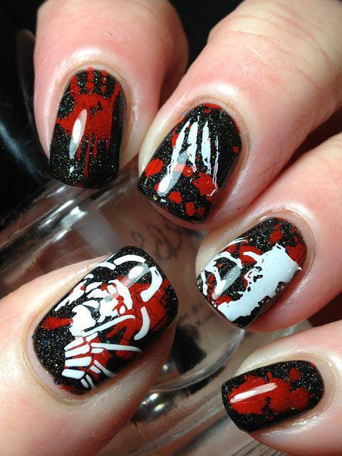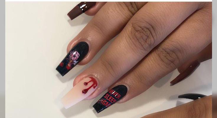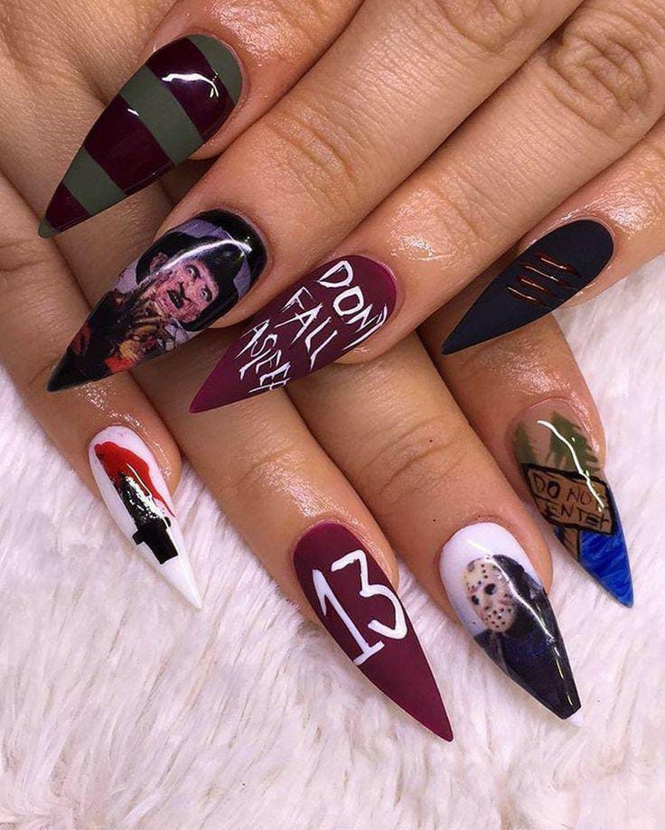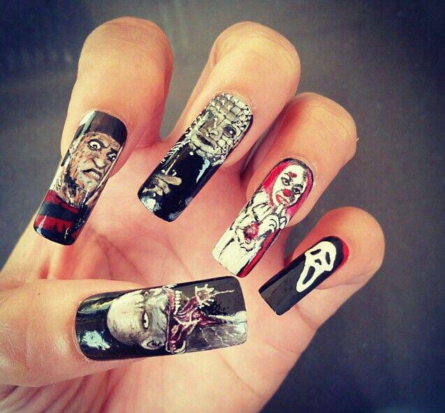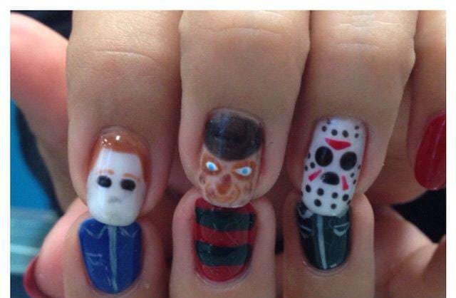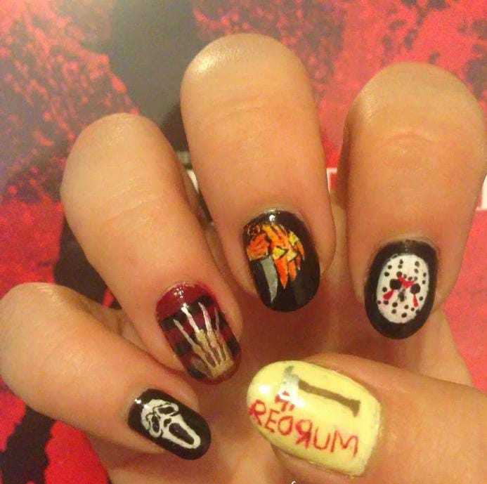 Shorter black nails featuring Freddy’s glove, Jason’s mask, Ghostface, and “Redrum” for a mash-up of classic slasher villains.