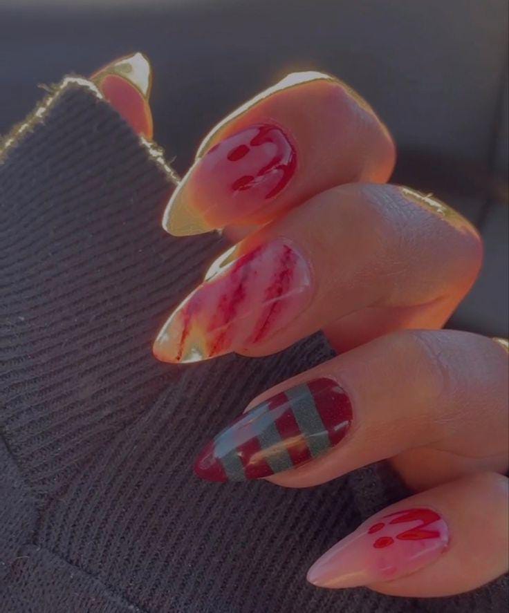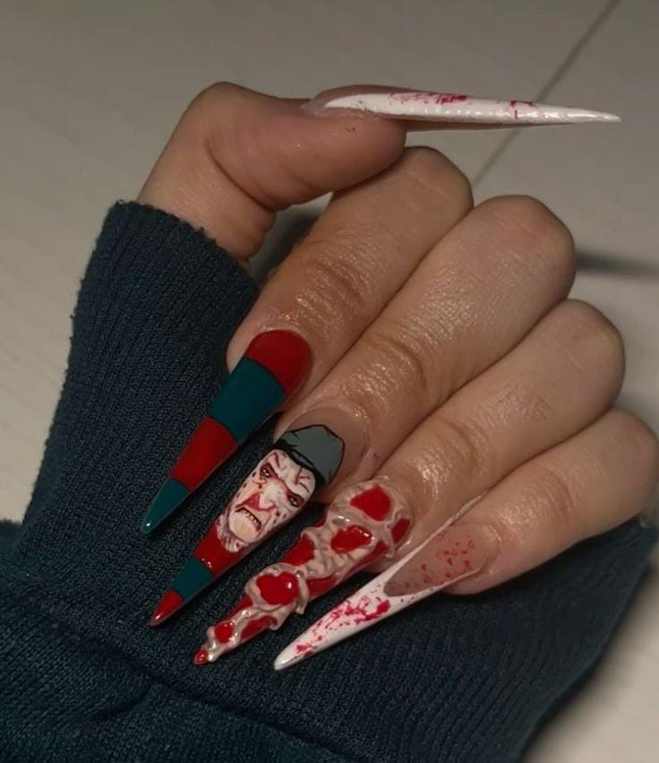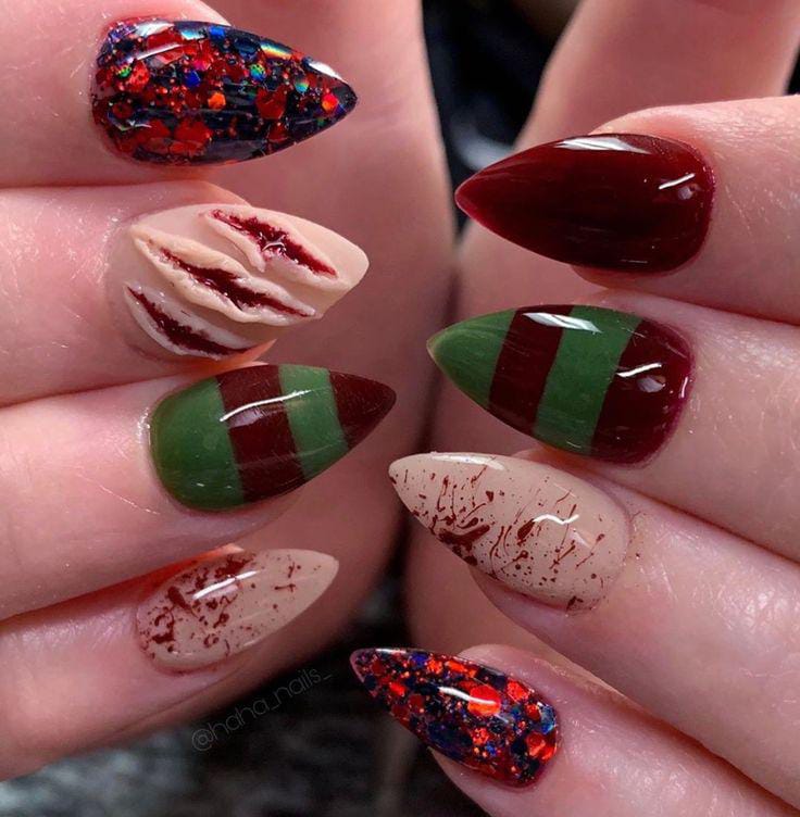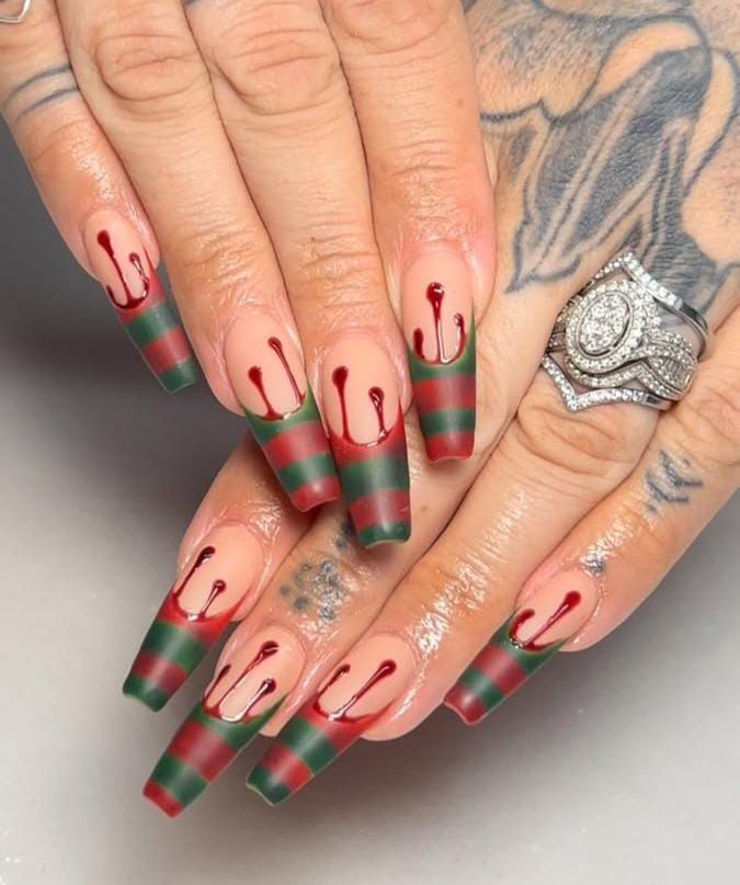 Long pointed nails mixing red smears, blood drips, and Freddy’s iconic green-and-red sweater stripes.