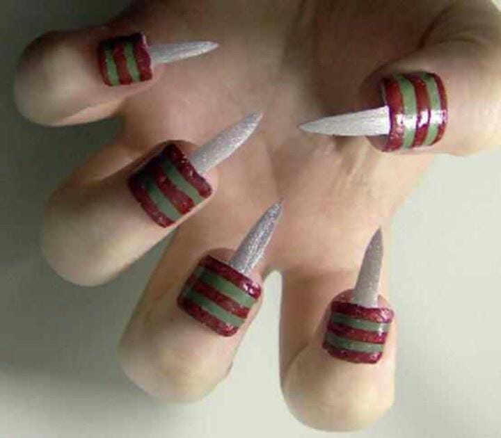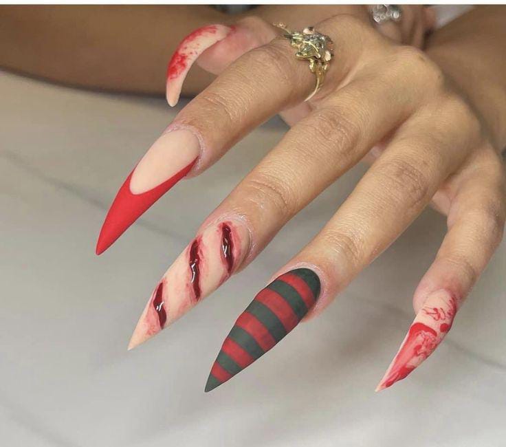 Extra-long stiletto nails with deep scratch-like designs, blood effects, and striped accents resembling Freddy’s sweater.