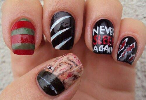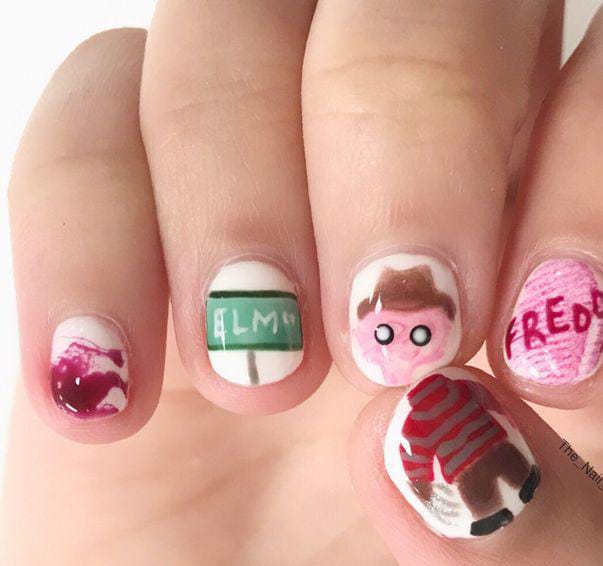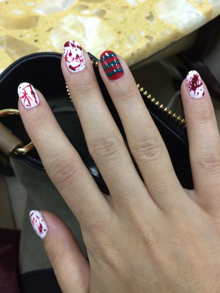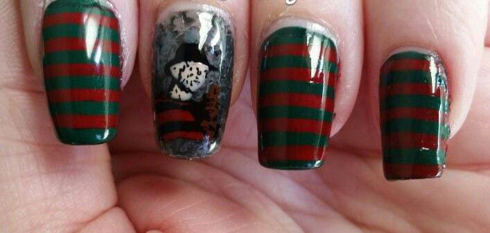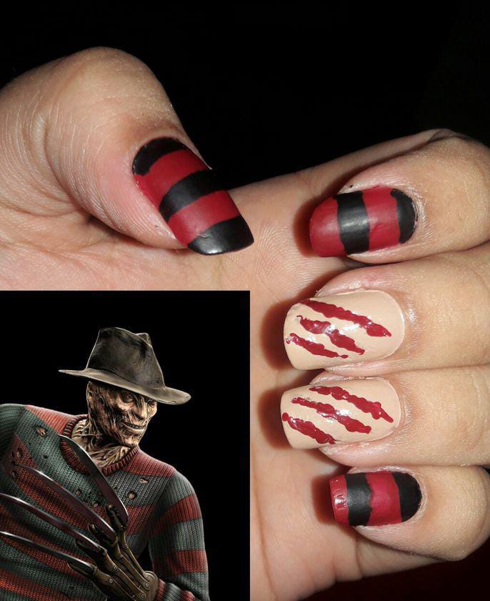 White nails splattered with blood paired with Freddy’s signature striped sweater design — simple but gory.