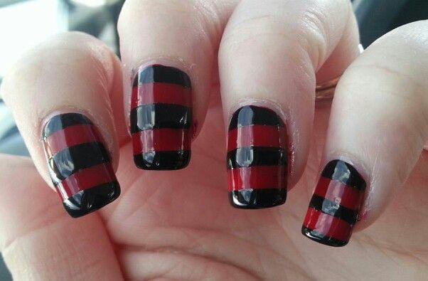 Glossy red and black striped nails give a sleek but eerie nod to Freddy’s classic colors.