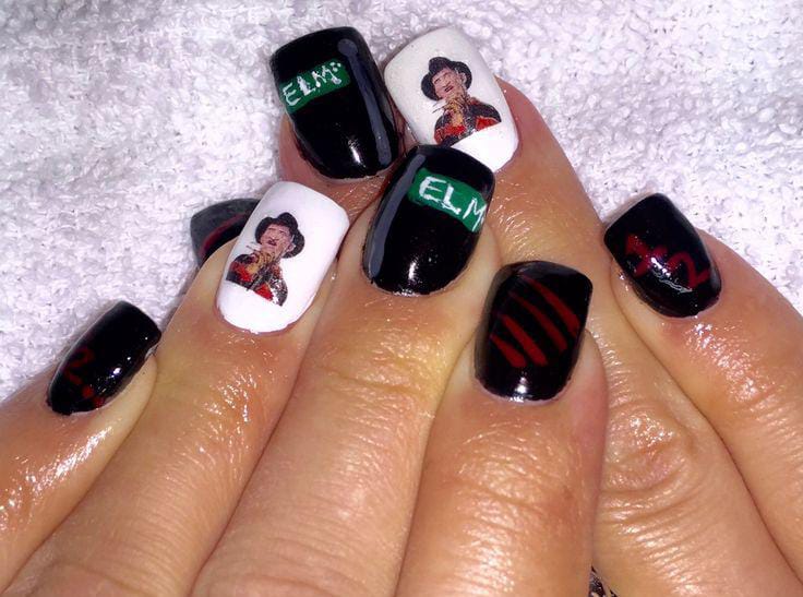 Black and white nails featuring Freddy art, “Elm” lettering, and red slash marks for a spooky themed design.