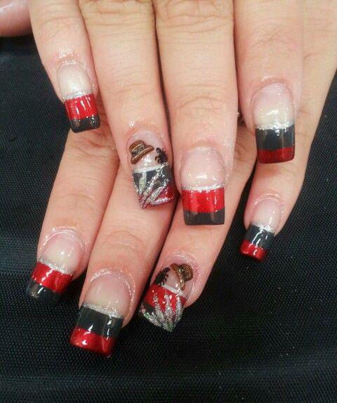 Red and black striped nails paired with claw mark accents capture Freddy’s iconic sweater and slasher vibe.
