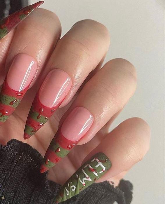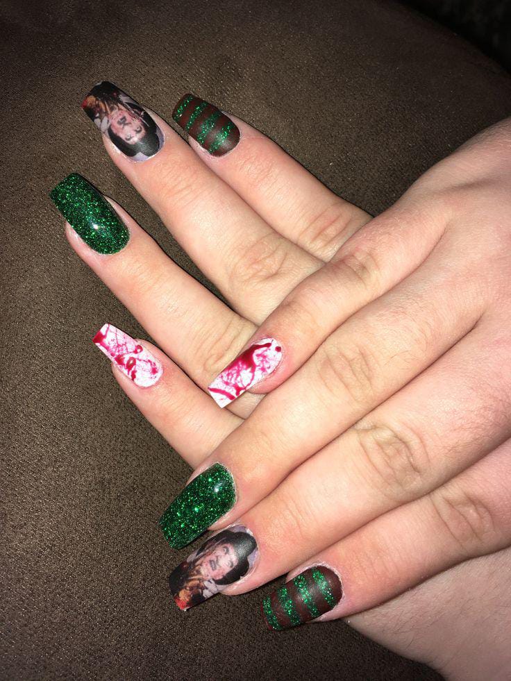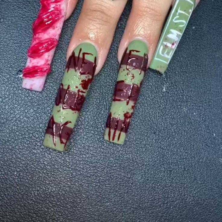 Extra-long green nails streaked with bloody red lettering and details, paying tribute to Elm Street in a chilling way.