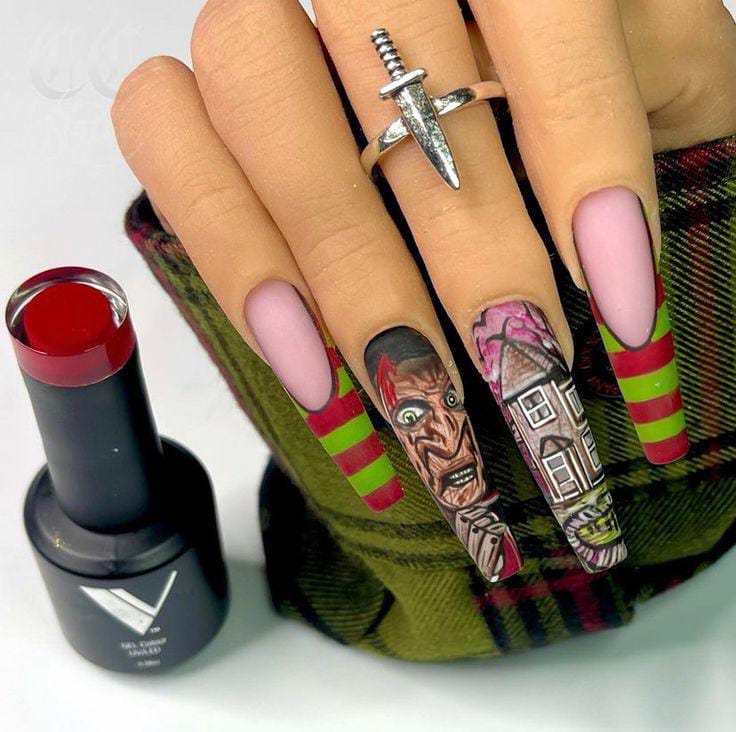 Long coffin nails with Freddy’s face, his iconic green-and-red stripes, and a detailed house design for a dramatic, cinematic finish.