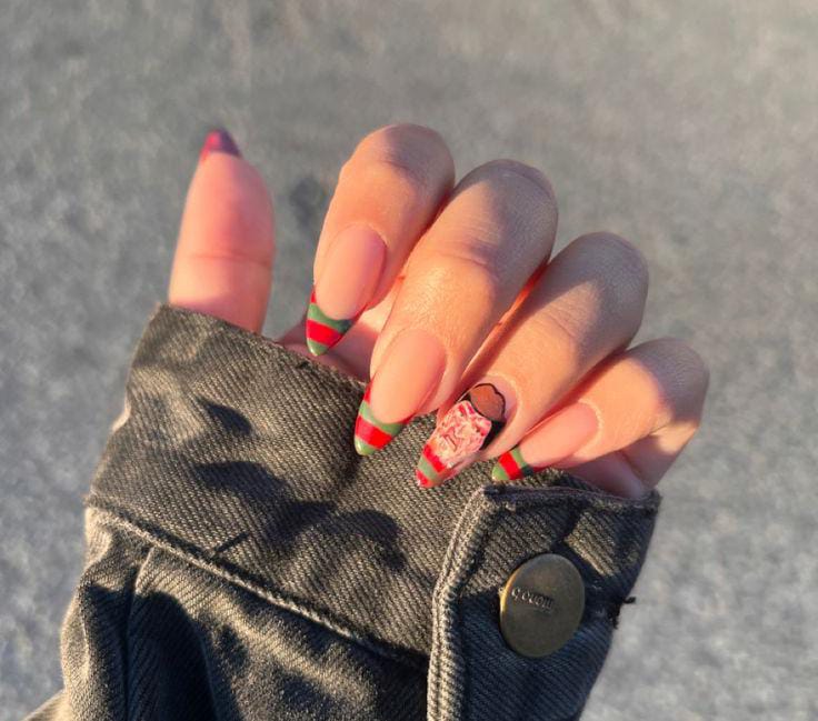 Subtle nude base nails with green and red striped French tips, plus one accent nail with Freddy’s face, create a spooky yet playful vibe.