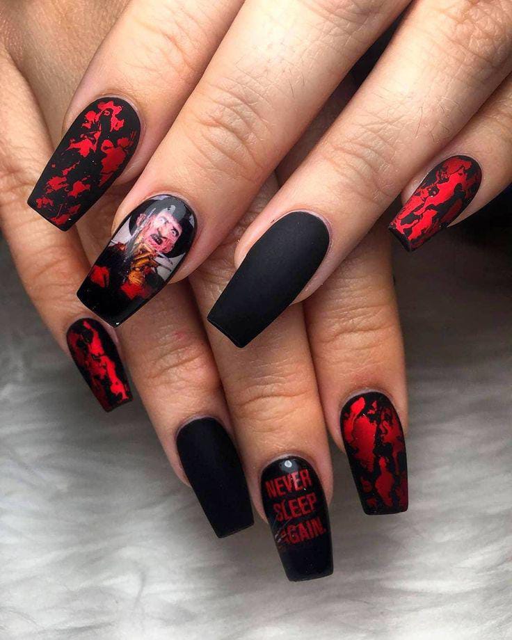 Matte red and black nails with bloody handprints, dripping patterns, and a Freddy portrait for a bold horror look.