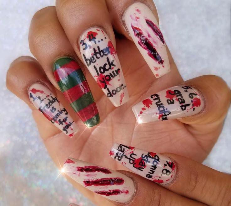 These nails feature long coffin shapes with blood-red slash marks, splatters, and Freddy’s eerie rhyme painted across a beige base, giving a creepy slasher-horror vibe.