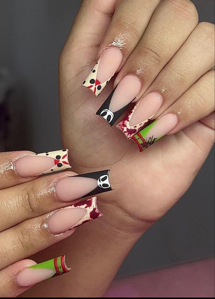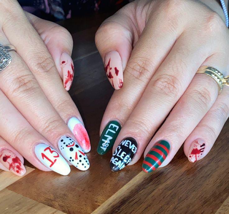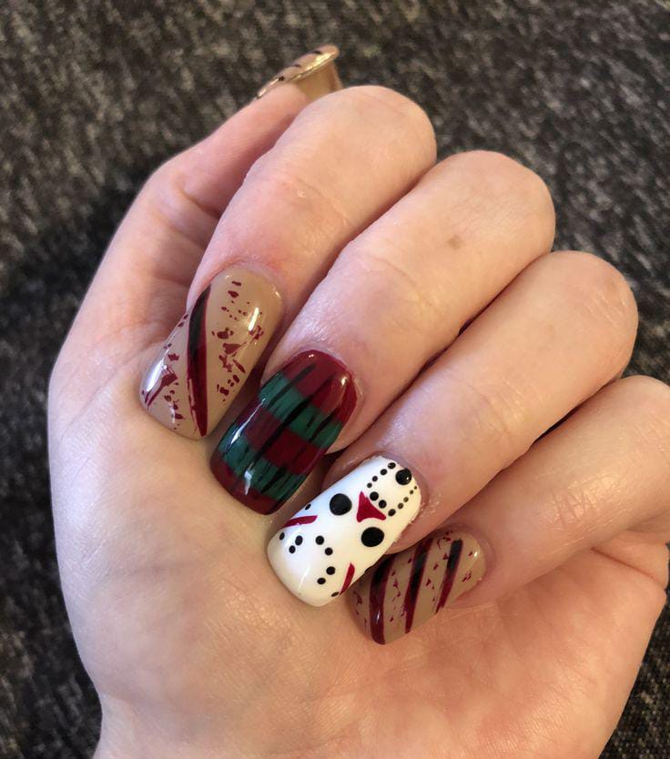 A mix of tan nails with blood splatters, red-and-green stripes, and Jason-inspired mask art for a horror mashup vibe.