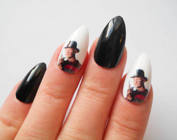 Classic black-and-white nails featuring Freddy Krueger’s portrait for a bold, minimalist but creepy look.