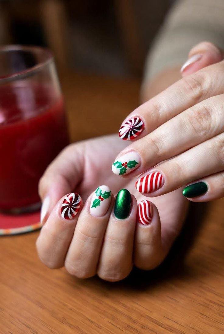 This design blends bold Christmas colors with playful patterns, featuring candy-cane stripes, glittery red polish, and hand-painted holly leaves for a bright and festive holiday fun.