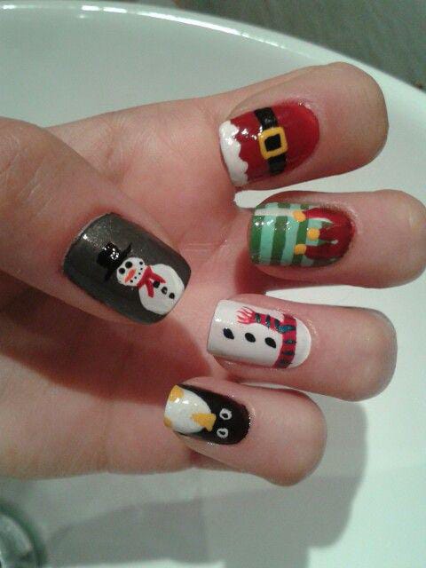 This playful design features a mix of cute Christmas characters—like snowmen, Santa suit accents, and a penguin—creating a colorful, cheerful vibe. The nails feel fun, youthful, and full of holiday personality.