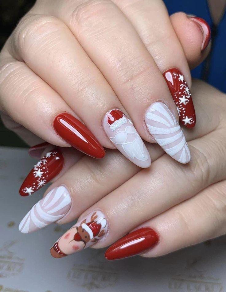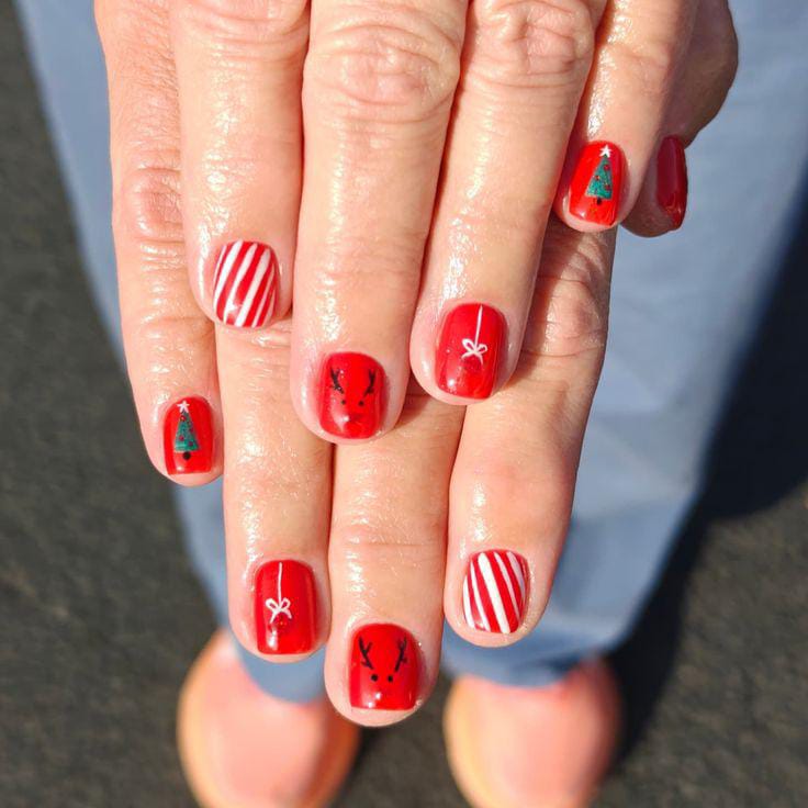 A bright red base is combined with candy-cane stripes, tiny bows, Christmas trees, and reindeer accents, creating a fun and traditional Christmas nail look.