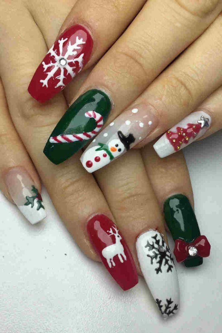 This design pops with red, white, and green nails decorated with classic holiday symbols like snowflakes, candy canes, reindeer, and Christmas trees. It has a lively, very traditional Christmas feel.