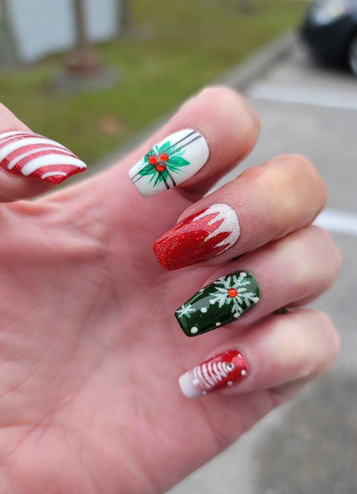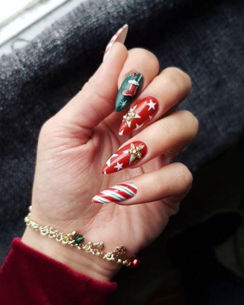 This design mixes bold red, green, and white with candy-cane stripes, stars, and festive 3D accents, giving the nails a playful yet glamorous Christmas holiday feel.