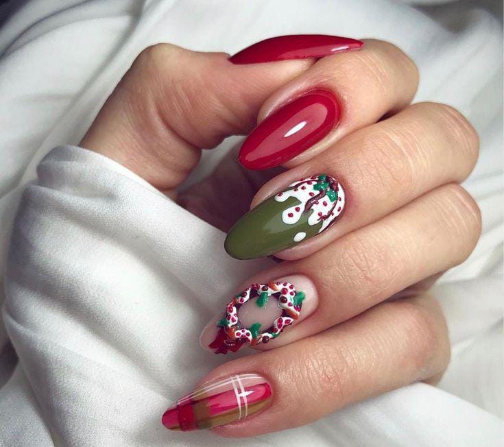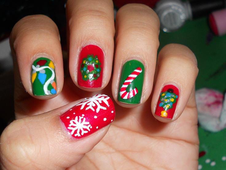 Bright red and green nails are painted with playful Christmas icons like snowflakes, candy canes, wreaths, and string lights for a fun, childlike holiday vibe.